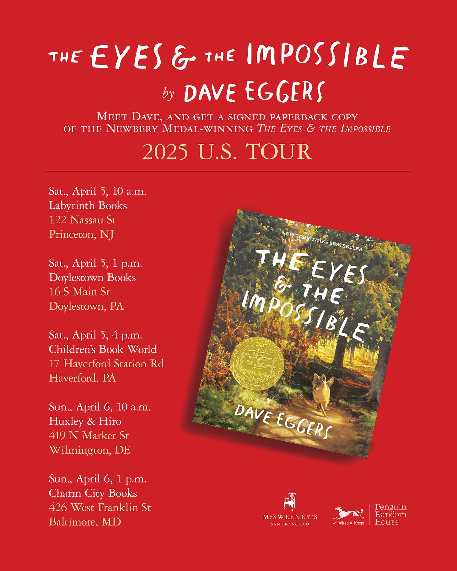 Hello, Substackers. We wanted to share a few upcoming events in the McSweeney’s world. First up, our founder, Dave Eggers, will be on a brief book tour in the Northeast next week in support of his Newbery Medal-winning book, The Eyes & the Impossible.