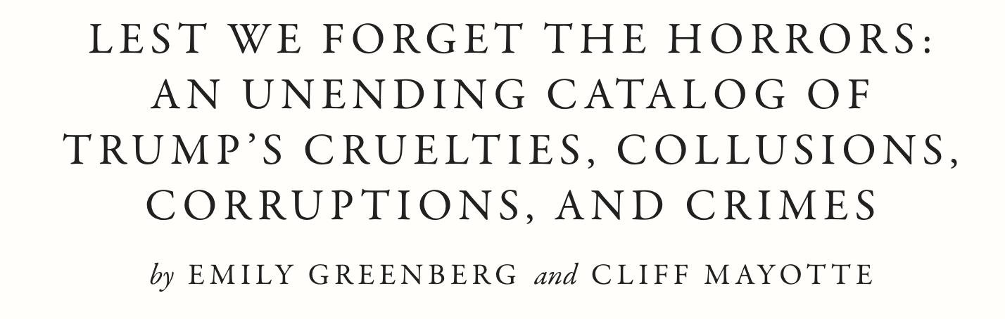 Early in President Trump’s first term, McSweeney’s editors began to catalog the head-spinning number of misdeeds coming from his administration. We called this list a collection of Trump’s cruelties, collusions, corruptions, and crimes, and it felt urgent to track them, to ensure these horrors—happening almost daily—would not be forgotten. Now that Trump has returned to office, amid civil rights, humanitarian, economic, and constitutional crises, we felt it critical to make an inventory of this new round of horrors. This list will be updated monthly between now and the end of Donald Trump’s second term.