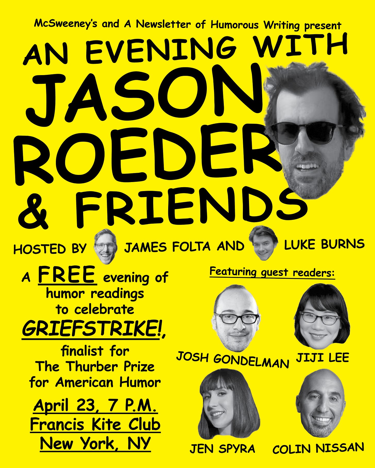 McSweeney’s and The Onion living legend Jason Roeder is a finalist for the Thurber Prize for American Humor for his brilliant book Griefstrike. The ceremony will be held in New York City next month, but a couple of days before we’re hosting a celebration of Jason’s work at the Francis Kite Club. James Folta and Luke Burns, our friends from Points in Case, will be the MCs, and Josh Gondelman, Jen Spyra, Jiji Lee, and Colin “Decorative Gourds” Nissan will also be reading.