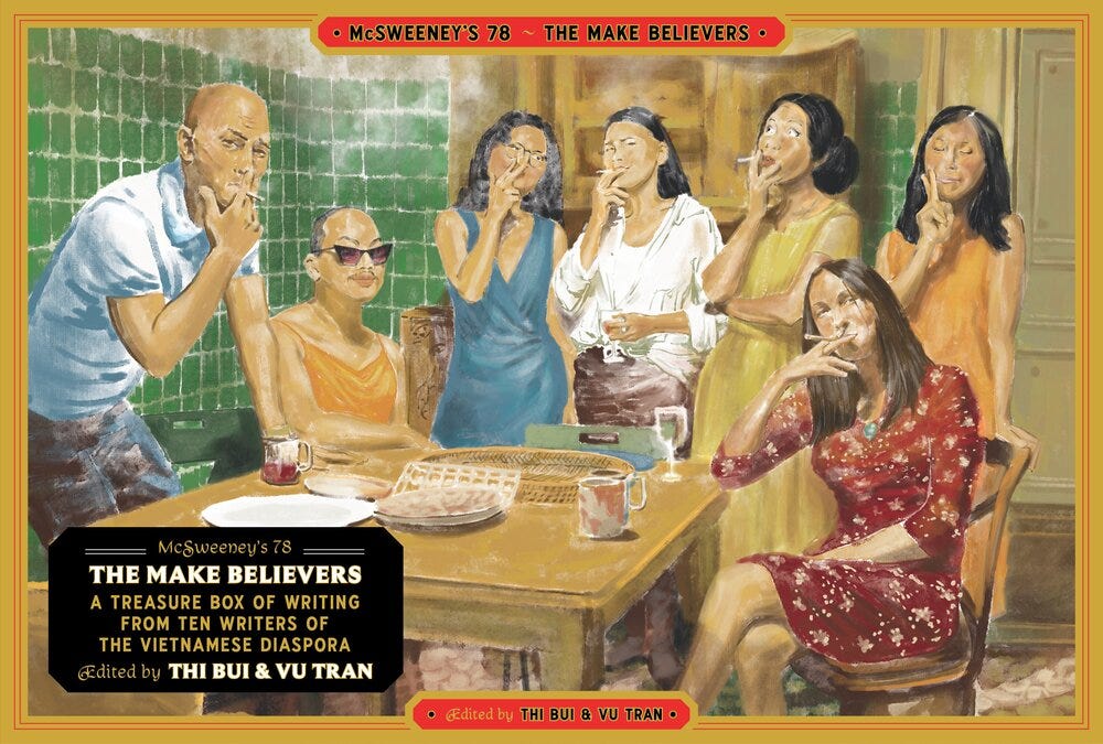 In McSweeney’s 78: The Make Believers (guest edited by Thi Bui and Vu Tran), ten writers of the Vietnamese diaspora write from the eclectic hodgepodge that is their shared imagination of what it means to be “Vietnamese.” Packaged in a beautiful foil-stamped cigar box (with art by Bui on each and every surface), and including two booklets, one menu, and a glossary of broken Vietnamese, the work in this issue spans from highbrow to lowbrow, proper to naughty, logical to absurd, and painful to funny. Published on the occasion of the fiftieth anniversary of the end of the Vietnam War, its contributors work across perspectives and multiple languages. In this completely singular, nothing-else-of-its-kind anthology, these artists write (and illustrate!) from a place of collective loss and joy.